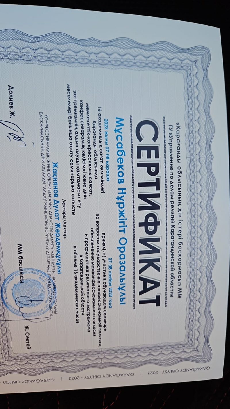 Саран қалалық мешітінің имамы Нұржігіт Оразалыұлы Қарағанды облыстық дін істері басқармасының ұйымдастыруымен діни экстремизімнің алдын-алуды қамтамасыз ету мәселелері бойынша өткен оқыту семинарына қатысты.