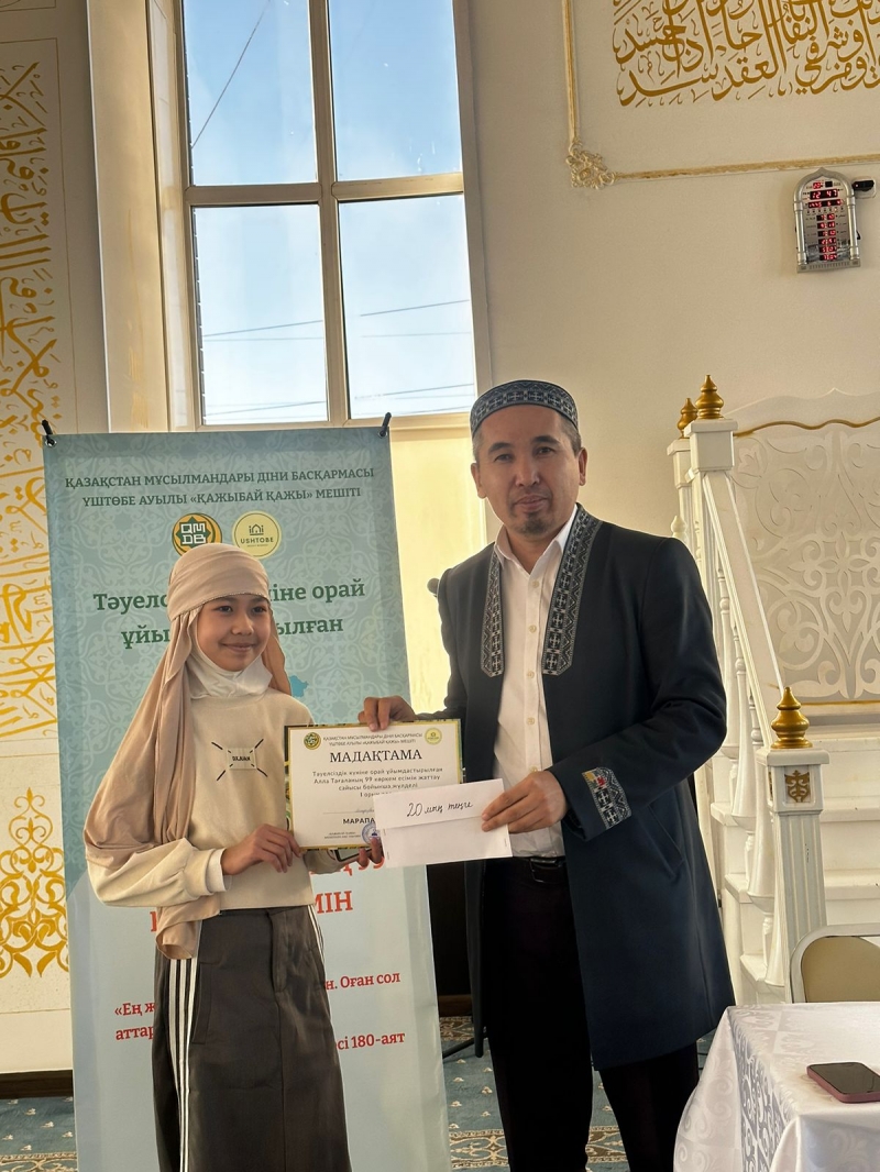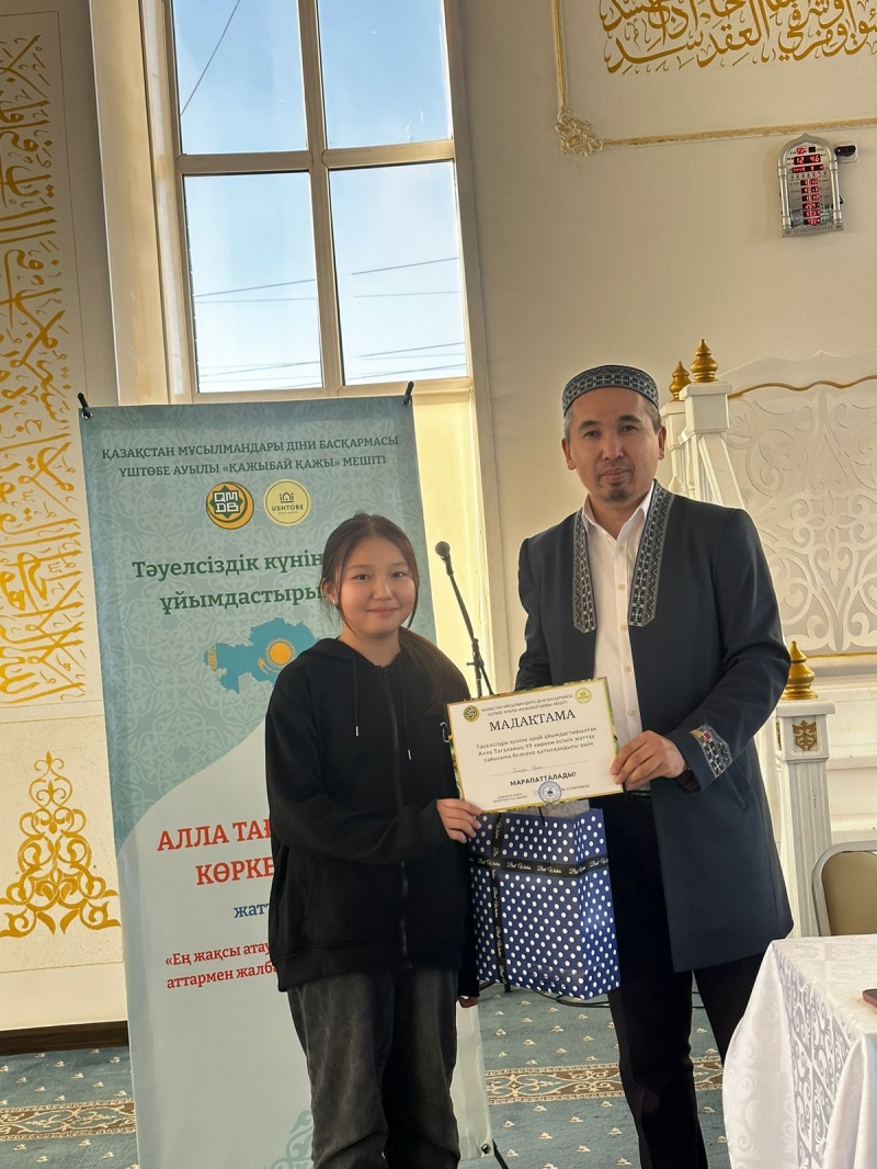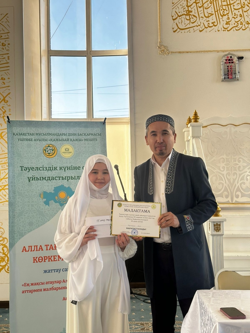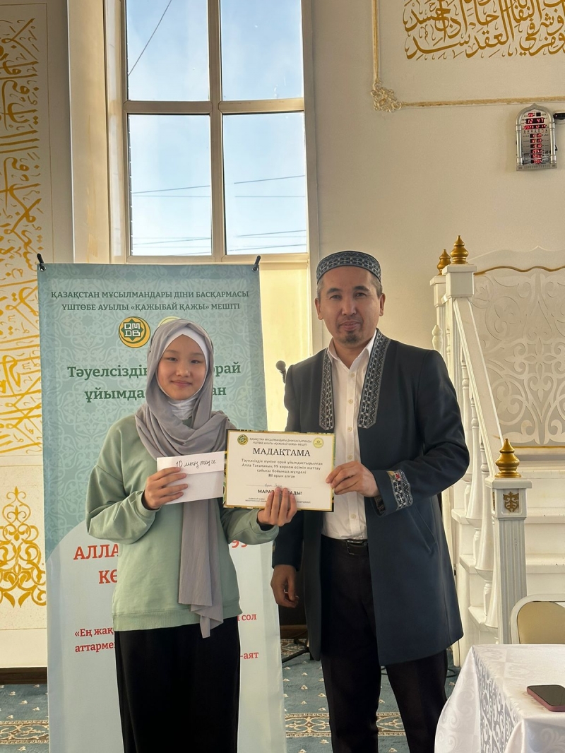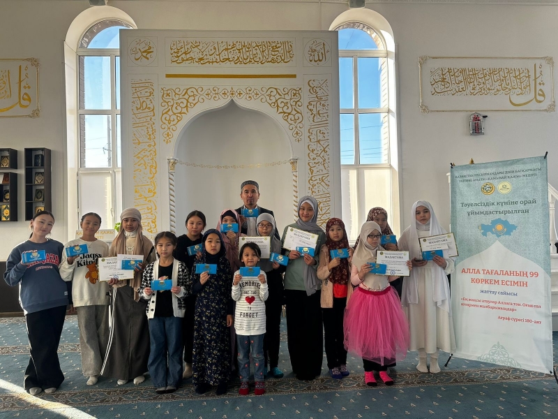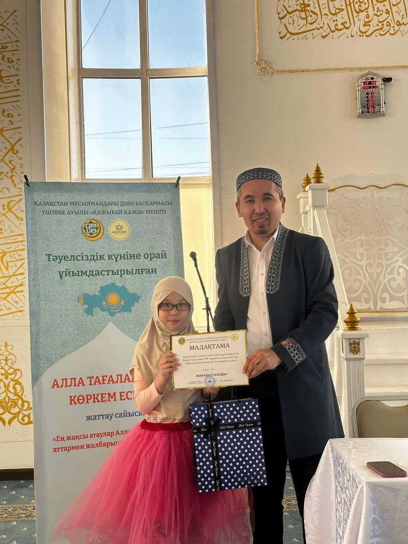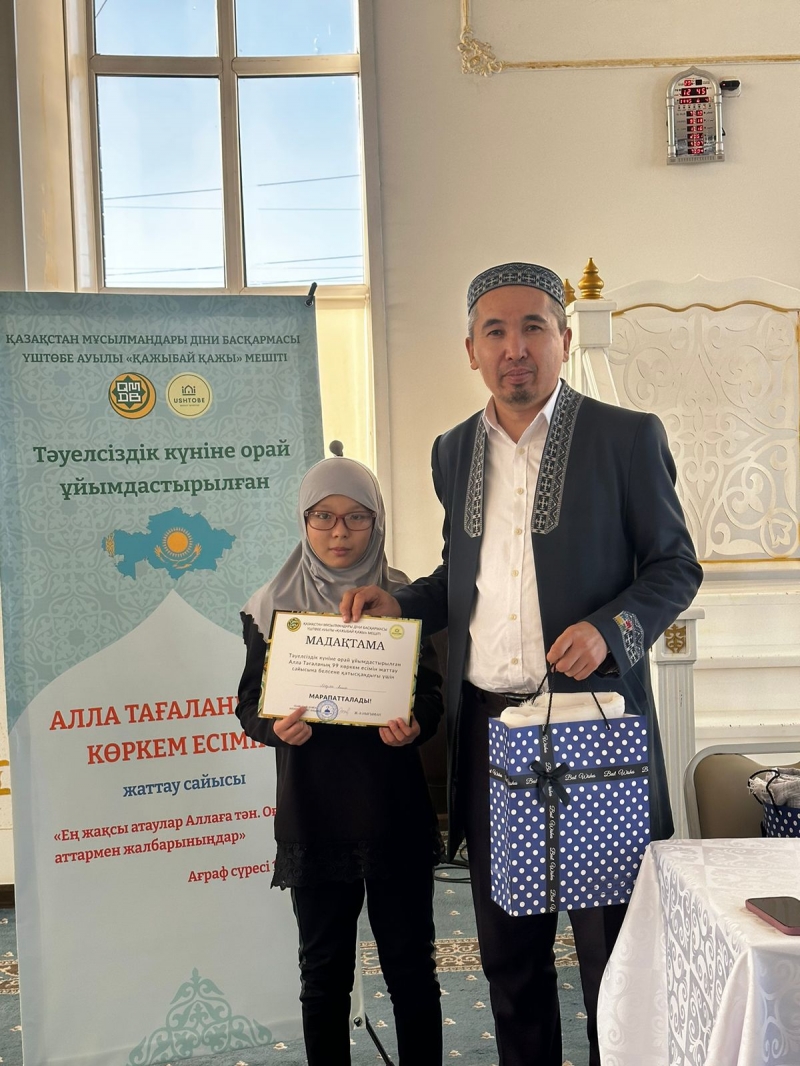 Қарағанды облысы, Бұқар Жырау ауданына қарасты Үштөбе ауылдық «Қажыбай қажы» мешітіжанындағы «Үштөбе оқу-ағарту орталығы» қайырымдылық мекемесінің ұстазы Мариям Бауыржанқызының ұйымдастыруымен шәкірттердің арасында Алла Тағаланың 99 көркем есімін жаттаудан байқау өтті.