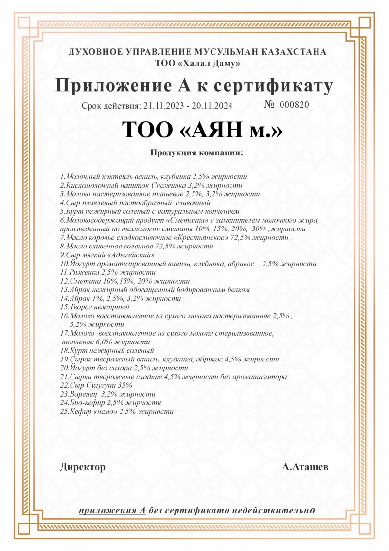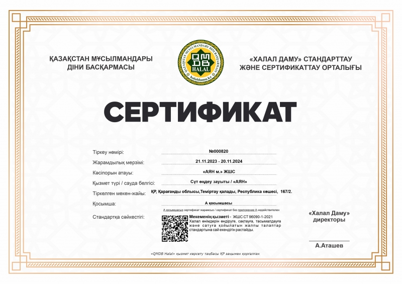Қарағанды халқына өзінің тіл үйірер сүт өнімдерімен танымал «АЯН» маркасы «Халал өнімдерді өндіруге, дайындауға, өңдеуге, сақтауға, тасымалдауға және сатуға қойылатын жалпы талаптар» стандарты бойынша «QMDB Halal» сертификатын жаңартты.
