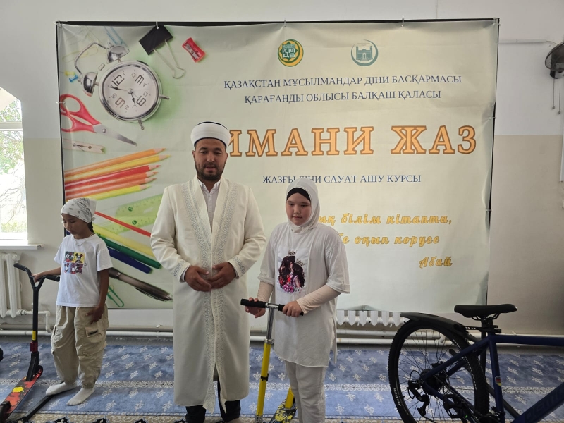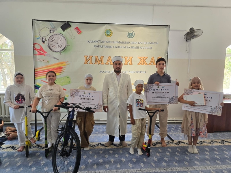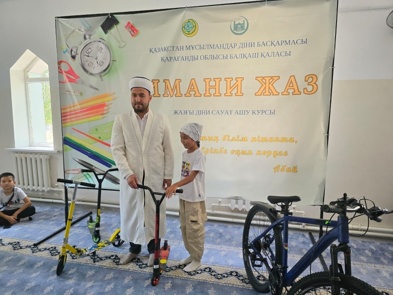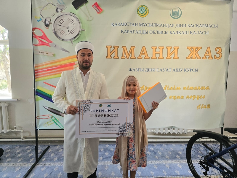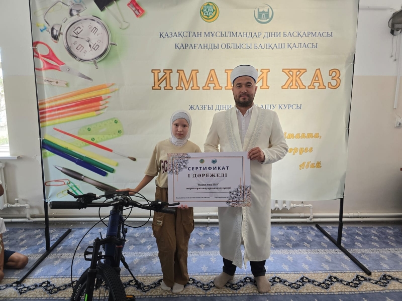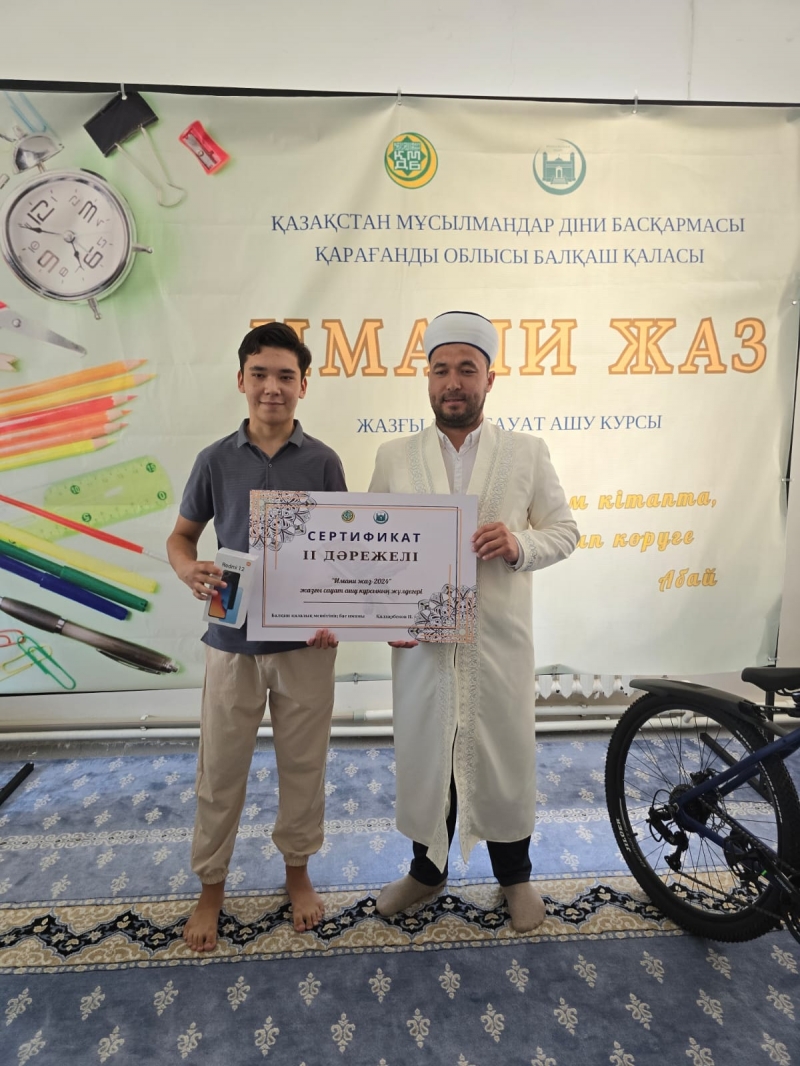 Балқаш қалалық мешітінің имамы Қалдарбеков Нұрболат Сейлханұлы курсты тамамдаған шәкірттерге өзінің ыстық лебізін білдіріп, құттықтай келе арнайы серификаттар табыстады. Сонымен қатар, үздік нәтиже көрсеткен шәкірттерді ерекше атап, ( 1 орынға- велосипед, 2 орынға ұялы телефон, 3 орынға планшет, 4,5,6 орындарға самокат ) сыйлықтар үлестірді.