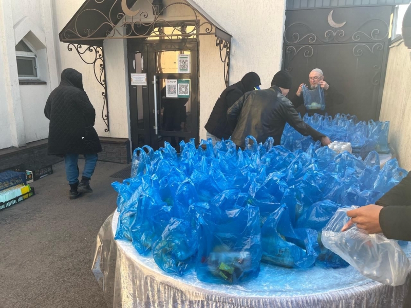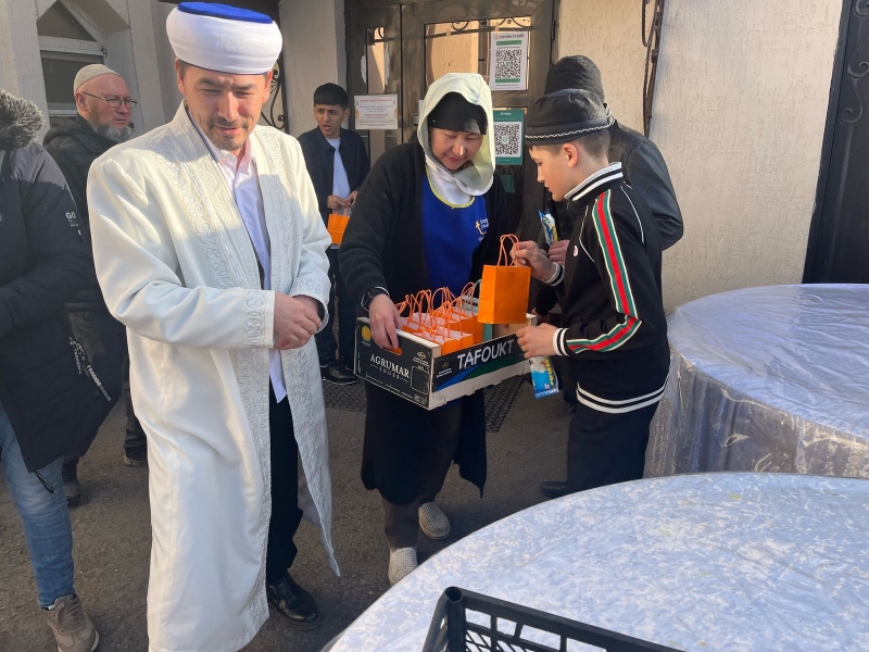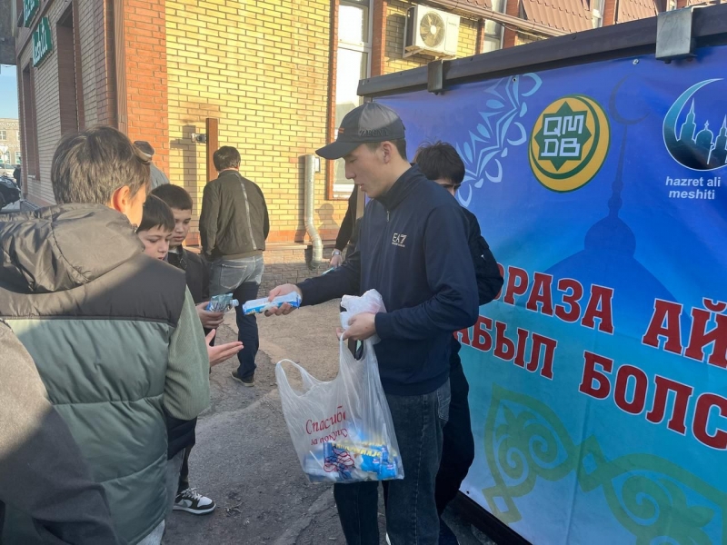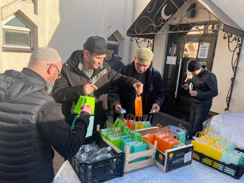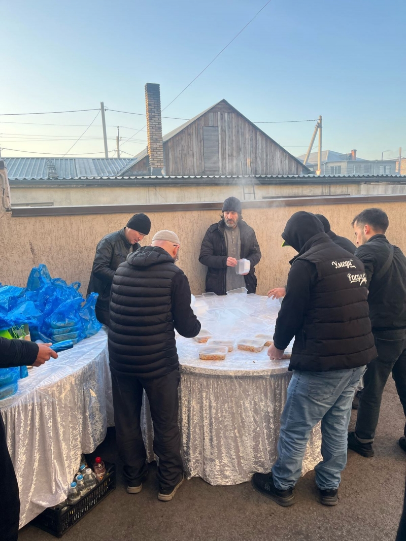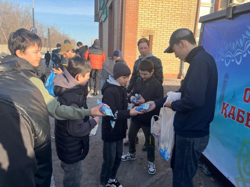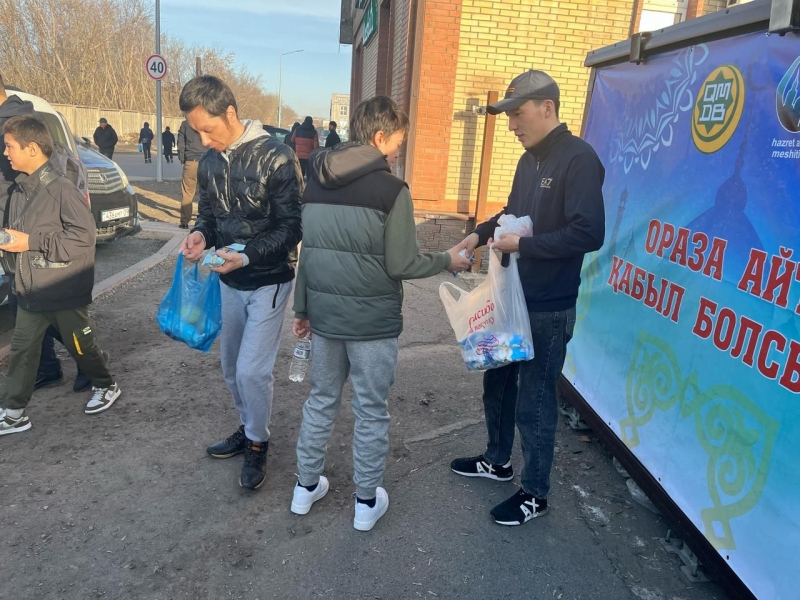 Айт намазынан кейін, мешіт ауласында жамағатқа ыстық палау үлестірілді.