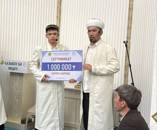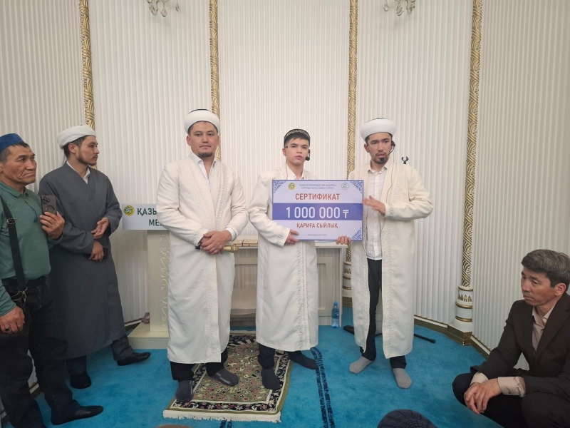 Алланың сөзін жаттаған қариға жамағат атынан ризашылық білдіріп, алғыс хатпен марапаттап, қаржылай бір миллион теңге сертификат табыс етті.
